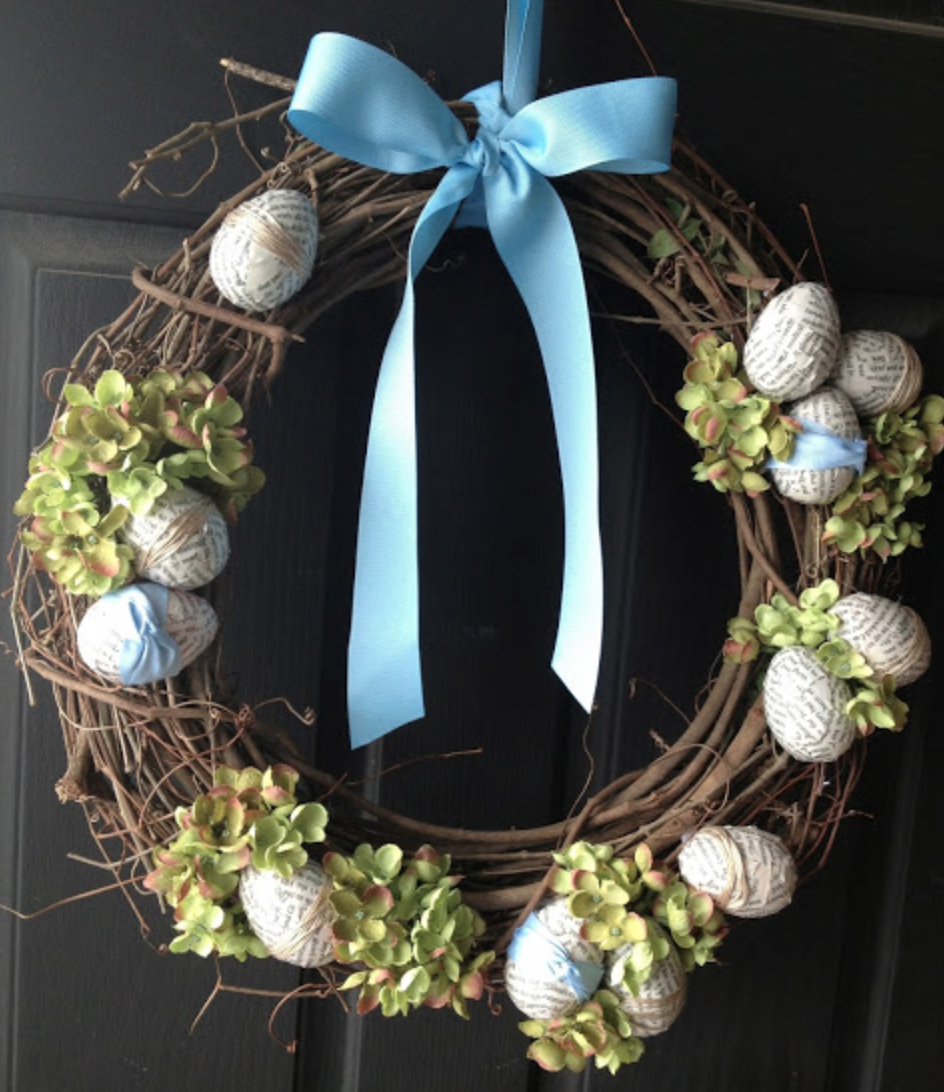 Ici, un tuto de Handmade in the heartland que j’aime beaucoup et surtout très simple à réaliser. Cette fois, on utilise des oeufs en plastique, des pages de papier imprimé style journal ou livre, de la colle spéciale ainsi qu’une couronne de branchages séchés, des petites fleurs en plastiques et du ruban. En anglais encore, mais facilement compréhensible grâce aux nombreuses images.